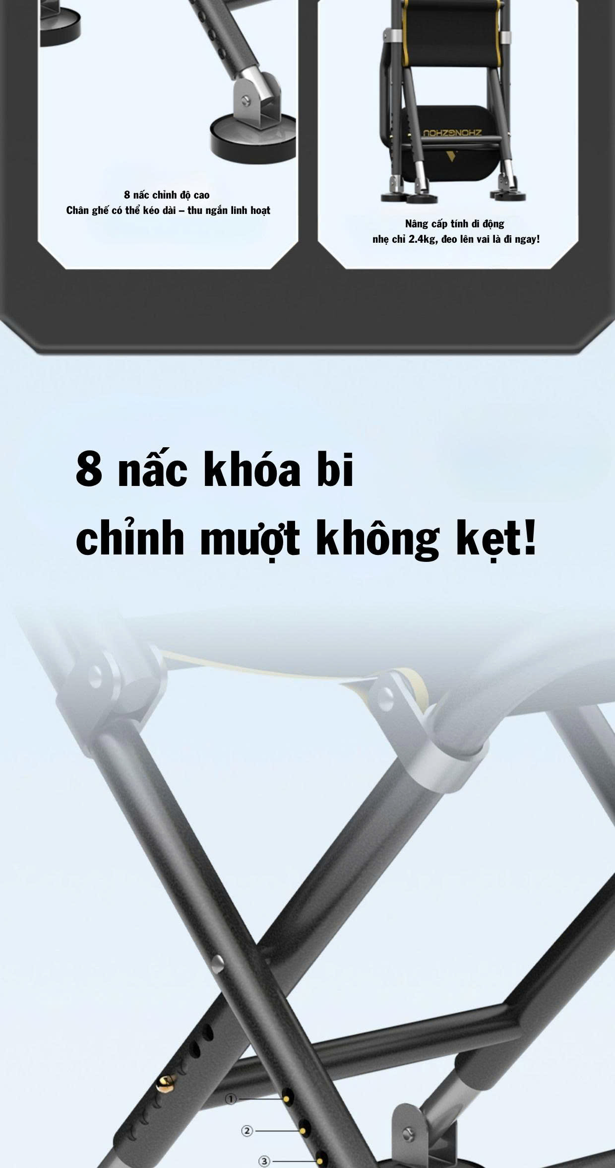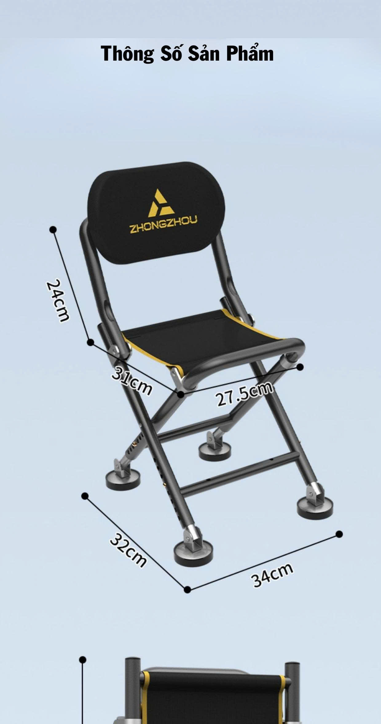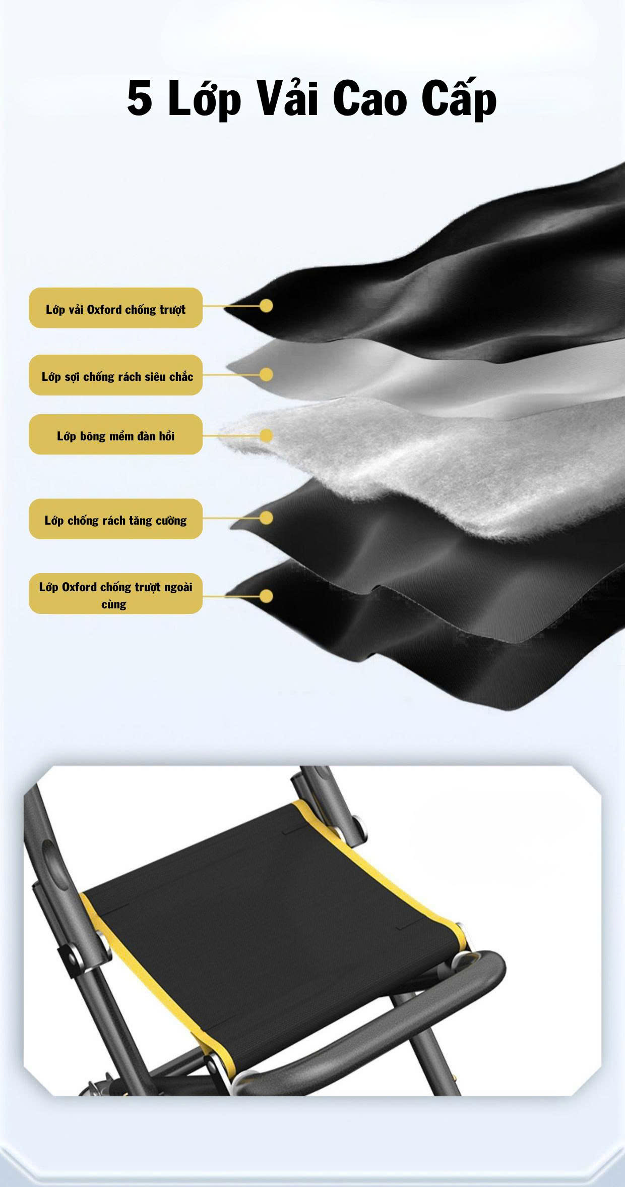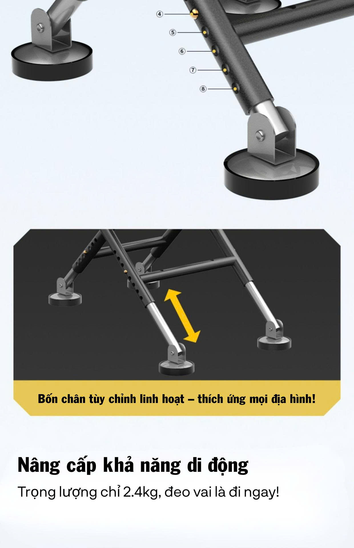 Khi gấp lại, ghế chỉ còn 54 x 34 cm, có thể đeo vai hoặc bỏ túi đựng chuyên dụng.⚙️ Chi tiết nổi bật-